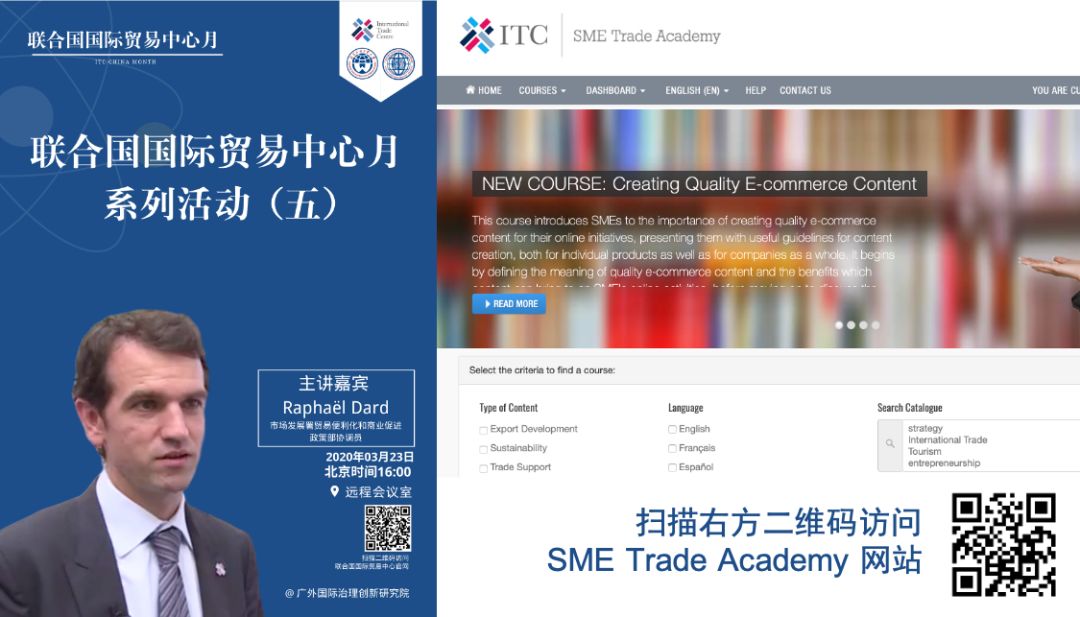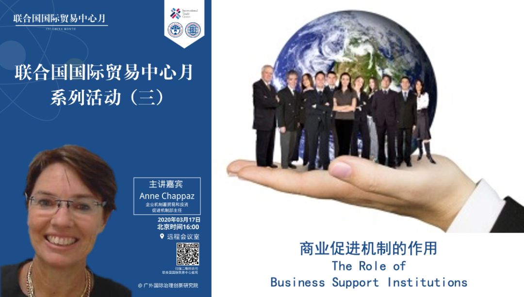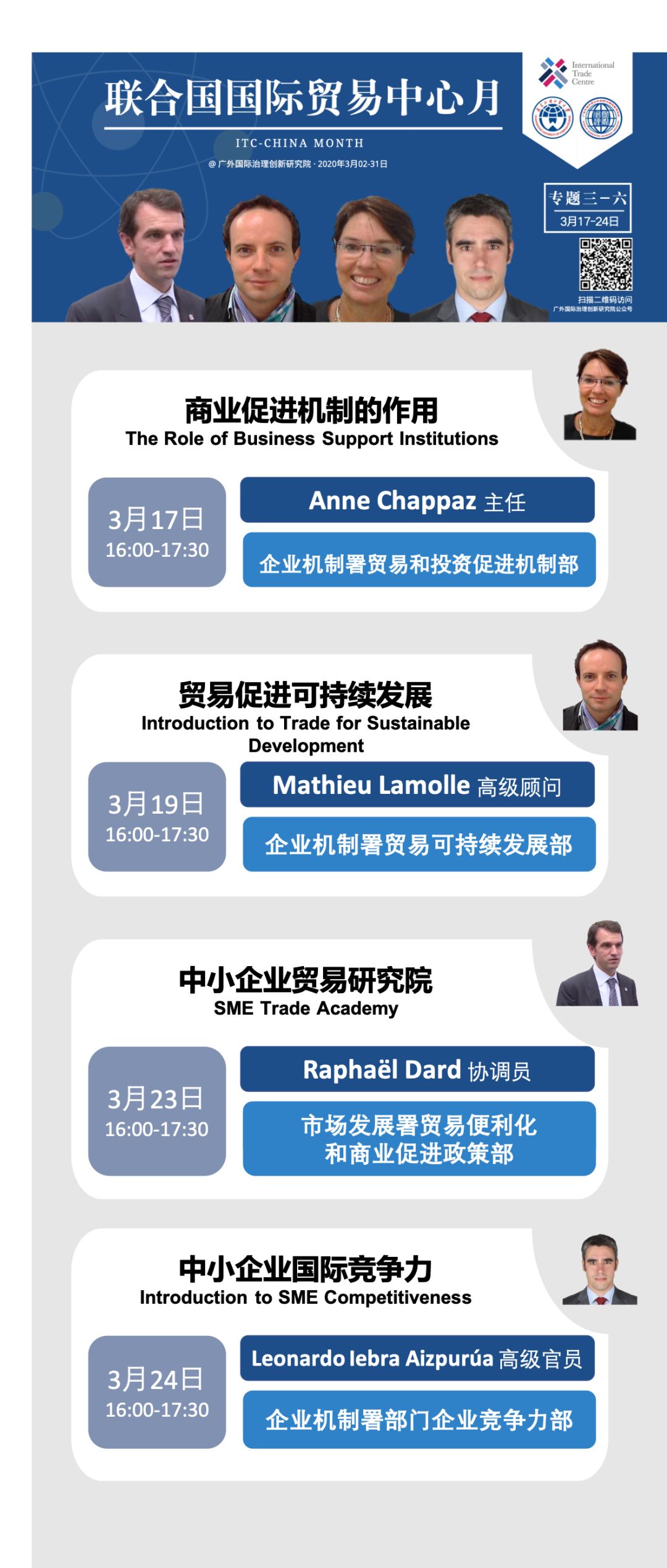 联合国国际贸易中心(ITC)与广东外语外贸大学国际治理创新研究院联合举办的“联合国国际贸易中心月”系列活动专题三、专题四、专题五以及专题六的讲座将分别于北京时间2020年3月17日、19日、23日和24日的16:00开始。其中,专题三是商业促进机制的作用(The Role of Business Support Institutions),专题四是贸易促进可持续发展项目介绍(Introduction to Trade for Sustainable Development),专题五是中小企业贸易研究院介绍(SME Trade Academy),专题六是提升中小企业国际竞争力(Introduction to SME Competitiveness)。负责相关系列专题讲座的主讲嘉宾是来自企业机制署贸易和投资促进机制部主任Anne Chappaz女士,贸易可持续发展部高级顾问Mathieu Lamolle女士,部门企业竞争力部高级官员Leonardo Iebra Aizpurúa先生,以及市场发展署贸易便利化和商业促进政策部协调员Raphaël Dard先生。