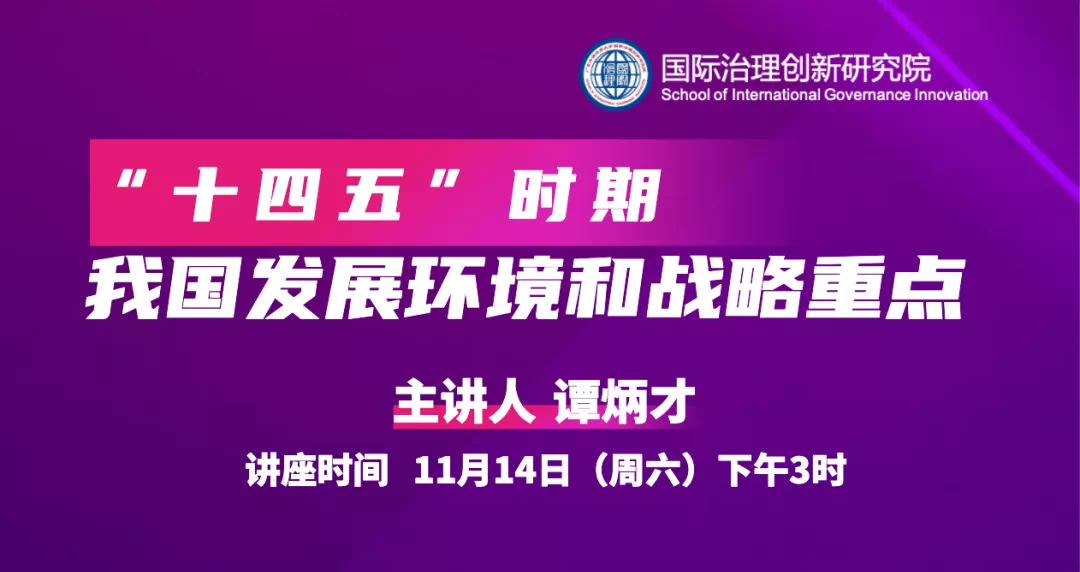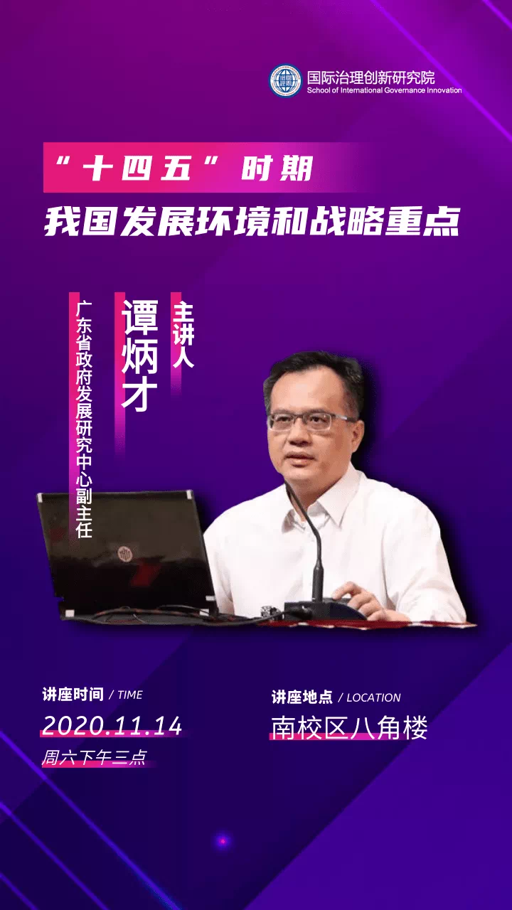 广东外语外贸大学研究生院、经济贸易学院和国际治理创新研究院,特别邀请广东省委宣传部讲师团成员、广东省人民政府发展研究中心谭炳才副主任,于2020年11月14日(周六)下午三点,就“十四五”时期我国发展环境和战略重点发表主题演讲,欢迎各位师生参加。