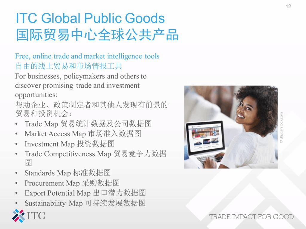 针对这三大主体和六大领域,ITC在全球范围内提供公共免费线上贸易和市场智能工具,如贸易地图、市场准入地图、投资地图、贸易竞争地图、标准地图、采购地图、出口潜力地图、发展可持续性地图等。目前,全球129个国家中已有大部分都接受了ITC公共智能工具的支持和协助。同时,ITC已有133个贸易相关的工具协助项目正处在计划执行中,共计投入1亿美金用于项目发展。