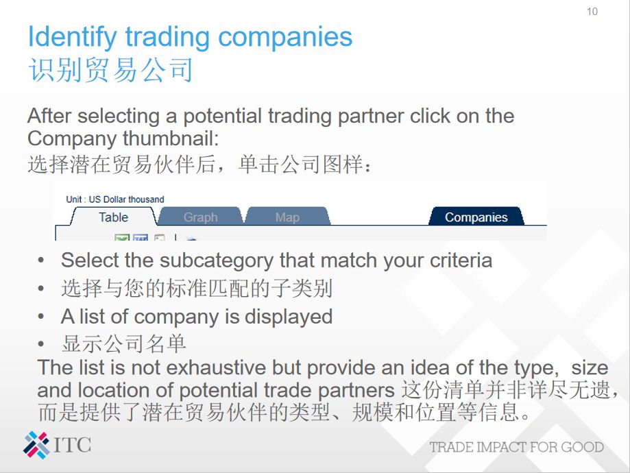 贸易地图能够识别贸易公司,提供有关潜在贸易伙伴的类型、规模和位置等信息。