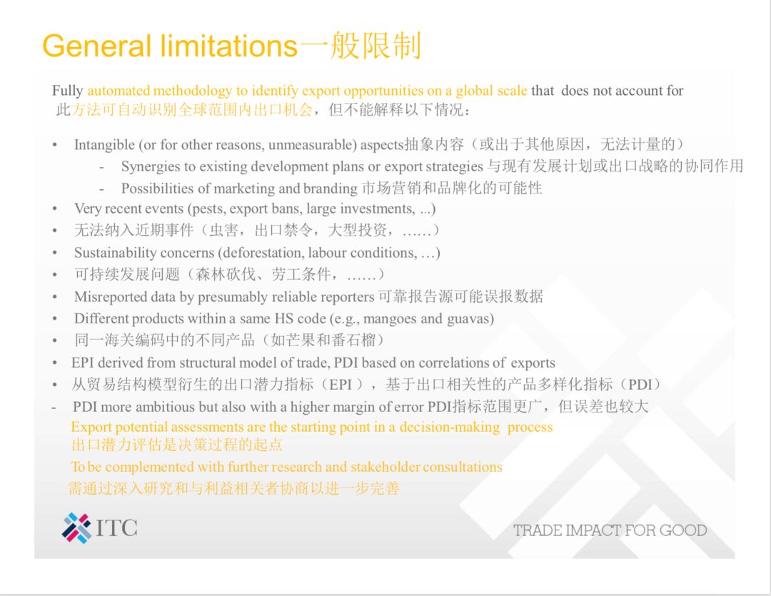 由于个别海关编码可能包含不同产品,、可靠报告员可能误报数据等现实条件限制,出口潜力数据图地图仍存在一定误差,使用者们可将其作为决策的参考数据之一,并需要结合现实情况进行深入对比研究。
