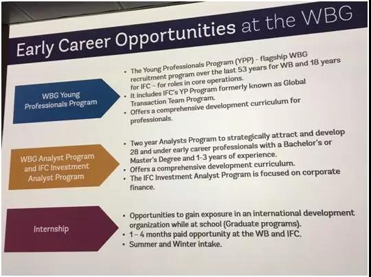 参观完游客中心后,世行人力资源部也专门给我们介绍了几种入职世界银行集团的途径,包括世界银行YPP项目、世行分析师项目和IFC投资分析师项目。这些项目都是针对有意向加入世界银行集团的青年人士开放,申请要求一般需要硕士及以上学历,且具备良好的英语沟通能力以及1到3年的相关工作经验。据世行青年专业人员项目的负责人介绍,虽然这些项目都对公众开放,只要符合要求都可以报名申请,但是竞争却非常激烈,其中青年专业人员项目在第一年开始招聘时,就吸引到了超过12000封申请,而最终录取的只有数十人。