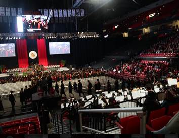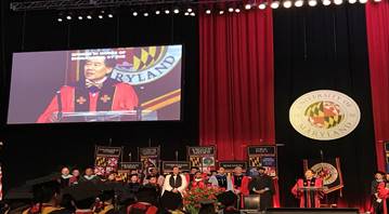 全校毕业典礼于晚上六点在学校的Xfinity Center盛大举行。整个毕业典礼的会场装潢庄重而明亮,十四个独立学院的院旗在主席台一字排开,各具特色。美国国旗和马里兰州州旗在学生护卫队的守护和全场注目礼中缓缓进场,在璀璨的灯光下迎风飘扬:它们将在这里见证近千名马里兰大学毕业生从这里扬帆起航,翻开他们人生的新篇章。