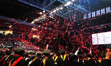 毕业典礼过去一个小时,迎来高潮部分——毕业生学位授予仪式。十四个独立学院的毕业生们分别站立,接受本院院长的对他们在马大学习生活的认可和对未来职业发展的寄语。我院院长Dr. Robert Orr在台上对我院学生殷切寄语:“公共政策学院的学子们,你们已经掌握了知识为政府和非营利组织贡献价值。你们的使命就是帮助人类解决饥饿,战争和人口贩卖等与全球的和平与发展密切相关的各种问题。在当下以及未来,话语可以是文明的,争辩是可以存在的,共识是可以建立的。现在的你们已经有能力可以使政府和非政府间组织的治理与合作臻于更好!祝贺你们,勇往直前!” 随后,各学院院长们在台上向所有毕业生、校领导和观礼嘉宾赞誉毕业生们学术生涯时期的播种、耕耘和丰收,并对他们的未来寄予厚望。院长们话音落下,整个毕业典礼达致高潮。校领导们面带慈笑,殷切注目;毕业生们回想往事,噙泪哽咽;前来观礼的亲朋好友们摇旗呐喊,沸腾欢呼;刹那间,乐团交响曲奏响,红色的彩带漫天绽放,整个会场掌声雷动,欢乐激昂!随后,在毕业生代表的带领下,毕业生们完成拨穗仪式,正式被授予学士学位和硕士学位,在学术生涯盖下庄严而郑重的印章!