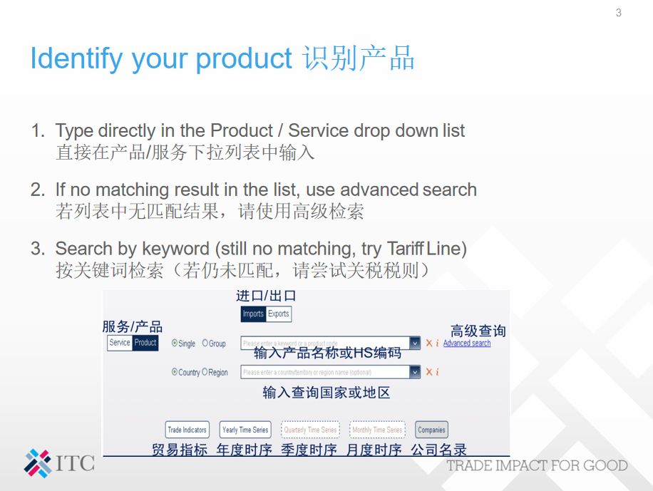 具体可分为三步:第一是通过6位数海关编码或国家进出口税则识别商品;第二是分析需求情况和贸易表现,包括市场规模与增长、市场份额等数据;第三是评估目标市场,如潜在竞争与供应国距离、潜在客户信息等。