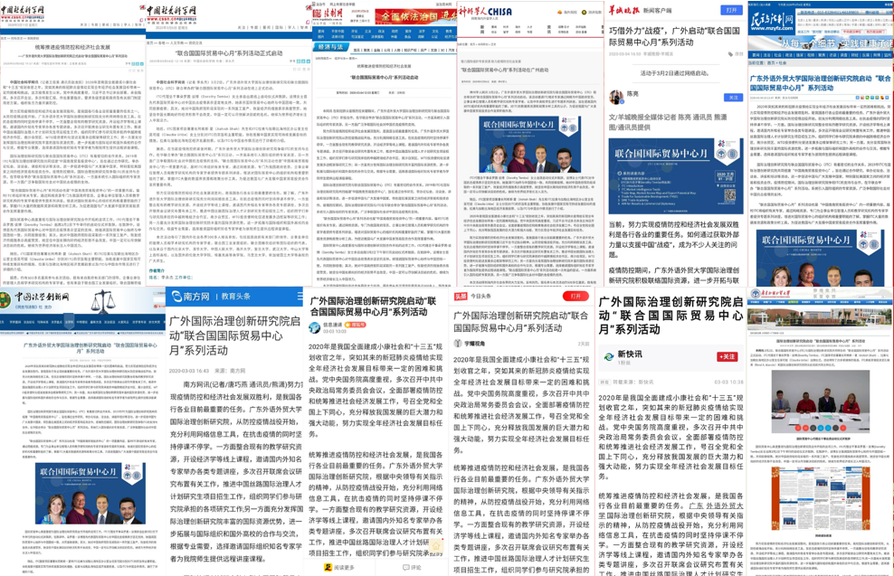 广东外语外贸大学国际治理创新研究院积极联络国际资源,发挥自己的国际化优势,进一步拓展与国际组织和国外高校的合作与交流。2020年3月,国际治理创新研究院与联合国国际贸易中心(International Trade Center,简称ITC)联合在华举办“联合国国际贸易中心月”系列活动,邀请国际知名专家学者为学院师生提供远程讲座课程,在交流中促进国际社会对中国抗击新冠肺炎疫情的了解,积极争取国际社会对中国“战疫”的支持。