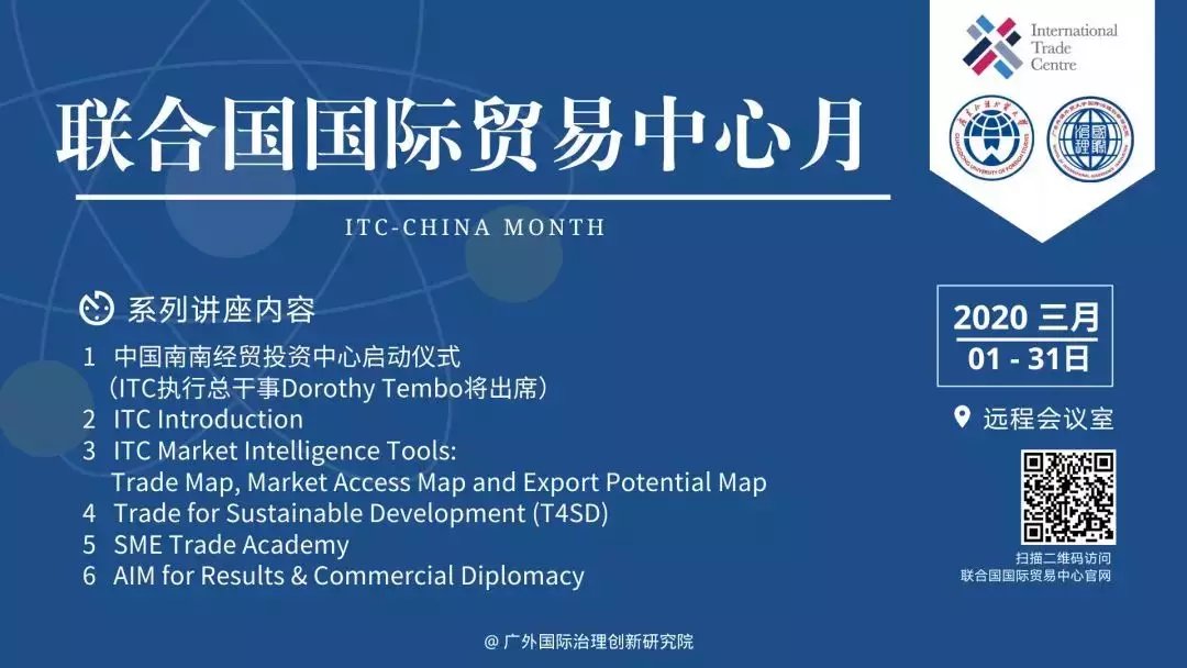 广外国际治理创新研究院与联合国国际贸易中心(ITC)世界银行等组织都建立了密切的合作关系。在疫情防控期间,研究院争取ITC的支持与合作,与ITC合作,联合在华举办“联合国国际贸易中心月”系列活动。通过网络资源,组织有关专家,专门为我国政府官员、企事业单位管理人员和教学研究机构的专家学者、学生提供系列专题讲座,增进对国际贸易中心组织机构和重要职能的了解,掌握ITC数据库资源和政策分析工具,及时了解国际市场的动态,抓住开拓国际市场的机会,为促进和深化我国与广大发展中国家贸易投资合作发挥作用。ITC与研究院于2019年共同组建了“中国南南贸易投资中心”,双方通过开展合作研究,举办论坛会、洽谈会、讲座和培训等活动,进一步促进中国与广大发展中国家、特别是拉美国家之间的经济贸易和投资合作。