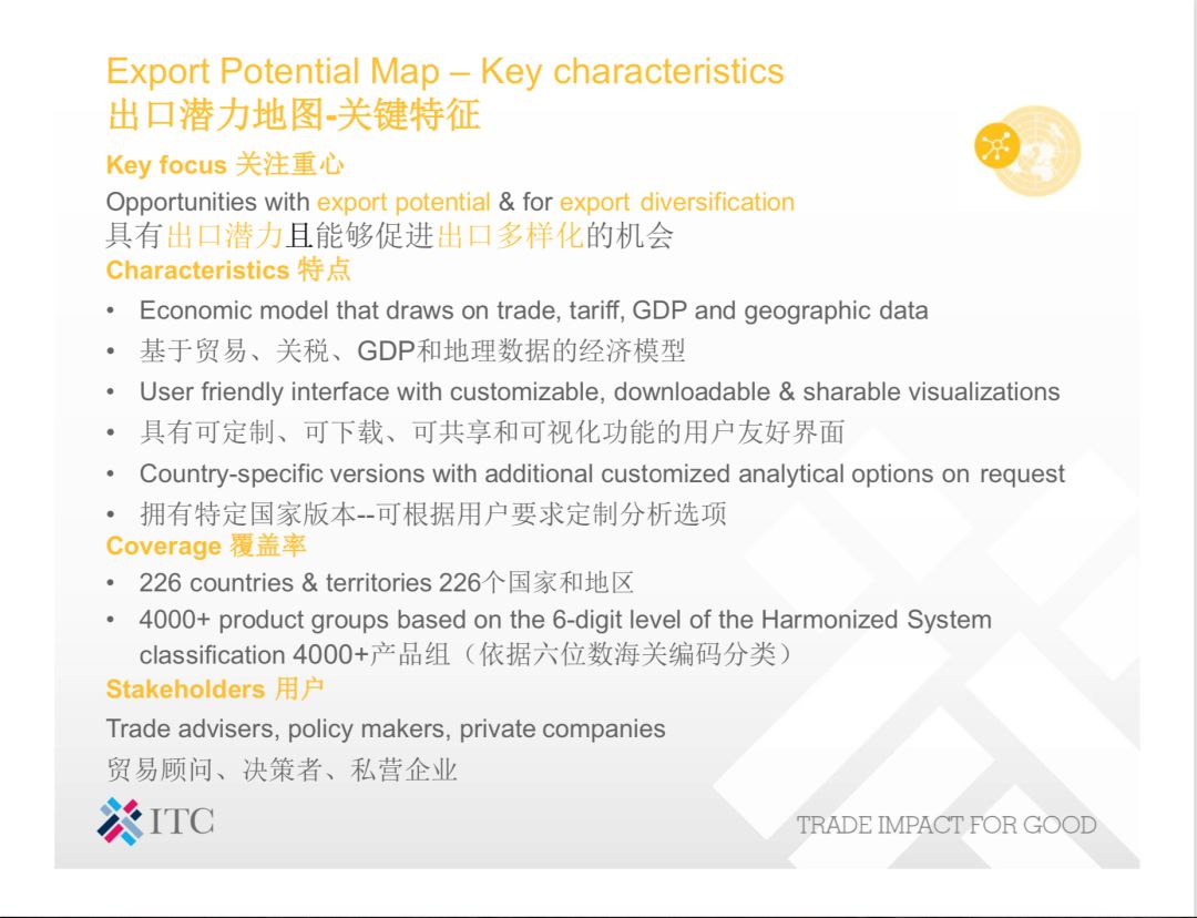 出口潜力地图是一类基于贸易、关税、GDP和地理数据的经济模型,具有可定制、可下载、可共享和可视化的用户友好界面,可根据用户要求定制分析选项,覆盖226个国家和地区,包含超过4000种依据六位数海关编码分类的产品组(少数产品除外)。贸易顾问、决策者、私营企业等目标用户可运用该模型了解特定国家和地区、特定产品的出口潜力,找出在区域和全球市场上有机会成功出口的新产品,促进贸易互通,增加现有产品和新产品的出口。