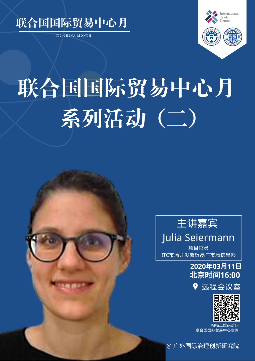 北京时间20203111600,联合国国际贸易中心(ITC)与国际治理创新研究院联合举办的联合国国际贸易中心月系列活动之专题二讲座第二讲顺利举行。