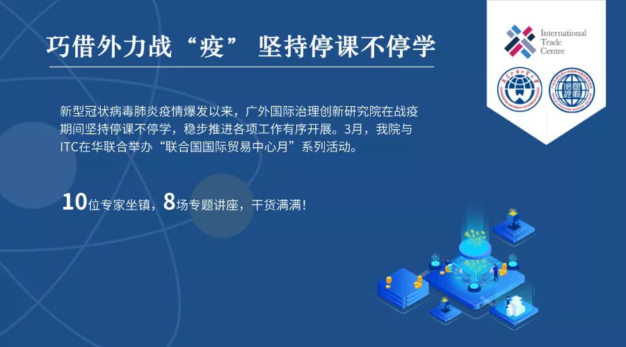 新型冠状病毒肺炎疫情爆发以来,广东外语外贸大学国际治理创新研究院坚持停课不停学、停课不停教,稳步推进各项工作有序开展。“国际组织月”活动是我院创建的学术品牌项目,联合国国际贸易中心是我院长期以来的友好合作伙伴。从3月1日到31日,我院与国际贸易中心(英文简称ITC)在华联合举办“联合国国际贸易中心月”系列讲座活动,取得圆满成功。本次活动一方面系统引入国际组织的专家资源,国际贸易中心选派10位专家做了8场专题讲座;另一方面是广泛争取国际社会对中国抗击疫情的理解和支持。