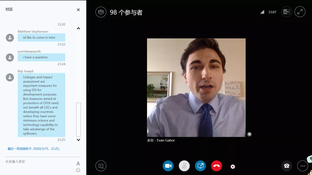 2020年4月30日,ITC就“投资便利化促进发展”的议题组织了第三次线上国际研讨会,国际治理创新研究院院长赵龙跃教授与部分同学受邀参会,持续跟进投资便利化促进发展谈判进展情况。同时,国际治理创新研究院已邀请哥伦比亚可持续投资中心高级研究员卡尔·萨文特(Karl P. Sauvant)教授于5月15日作为国际治理创新研究院“中国国际治理高端讲坛”的主讲嘉宾,系统介绍世界贸易组织投资便利化促进发展多边框架谈判,届时欢迎有关政府部门、企事业单位的领导,专家,高校师生,研究机构的研究人员参加。