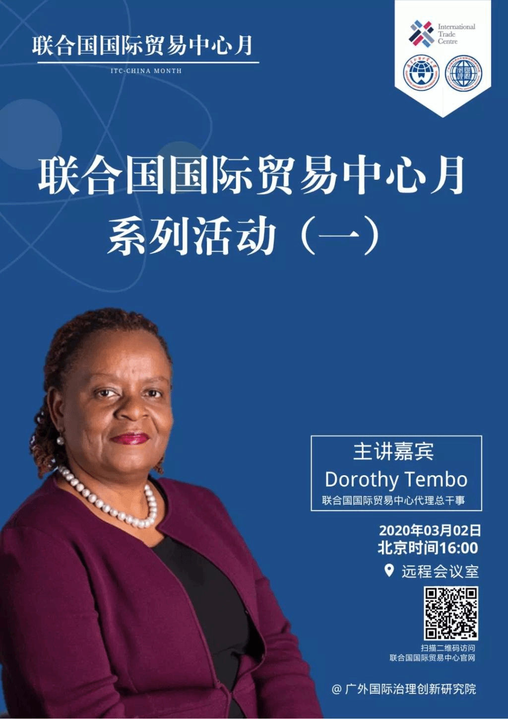 今年3月,国际治理创新研究院与ITC在华联合举办“联合国国际贸易中心月”系列讲座活动,取得圆满成功。本次活动是“中国南南贸易投资中心”成立以来的第一项活动,受到ITC的高度重视,代理总干事朵罗茜·谈博(Dorothy Tembo)女士亲自出席启动仪式并进行致辞。在致辞中,谈博女士首先代表国际贸易中心对中国抗击疫情表示坚定的支持,她强调国际贸易中心始终与中国团结一致,共同抵御疫情;其次,她对中国政府现阶段采取的一系列复工复产、恢复经济的措施表示高度赞赏,她坚信中国长期向好的经济形势不会改变,中国一定可以尽快解决目前的危机,继续为世界经济增长注入中国动力。(点击查看文章《讲座回顾 | ITC代理总干事出席“联合国国际贸易中心月”启动仪式并致辞》)