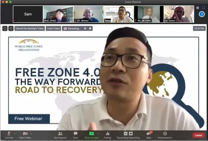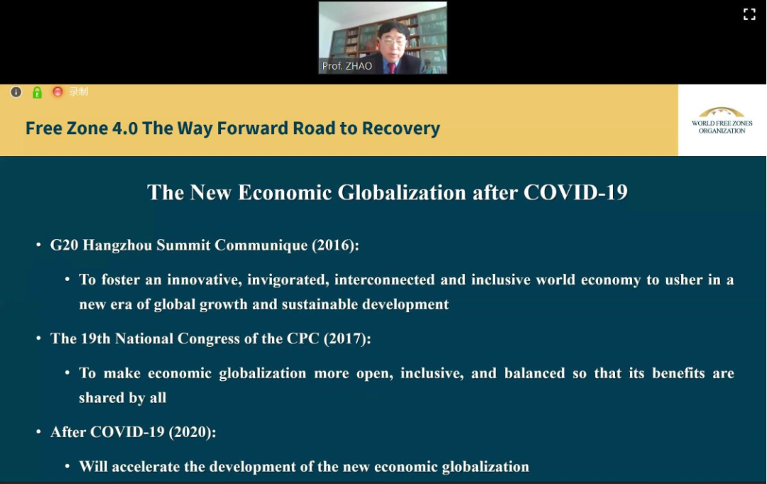 随着新冠病毒肺炎疫情在全球的蔓延,各国自贸区面临更多不确定性的挑战,如何抓住不确定时期的机遇,更有计划地进行规划促进发展已成为全球自贸区关注的焦点。为了给全球自贸区在困难时期提供支持,推进全球自贸区稳健发展,北京时间2020年5月7日下午,世界自由区组织中国办事处举办了主题为“自贸区4.0——前进之路 复苏之路”的线上研讨会,国际治理创新研究院院长赵龙跃教授应邀出席并进行主题演讲。