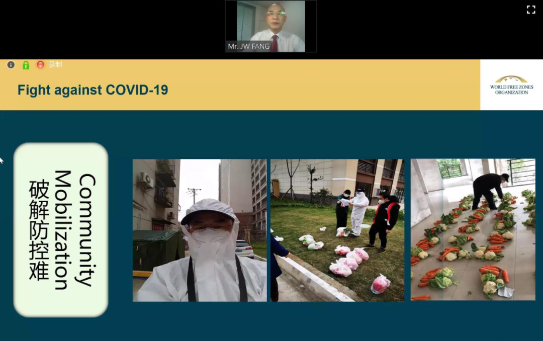 中国(湖北)自由贸易试验区工作办公室制度创新处方家文处长首先对湖北武汉疫情爆发的时间线进行了梳理,根据实际经验,总结了在疫情之下,湖北自由贸易试验区是如何破解防控、保供、用工、物流、资金、见面等困难。以及当下湖北自由贸易试验区的工作,加快企业复工复产、支持企业全球抗疫、以创新方式加强招商、继续激励创新创业。