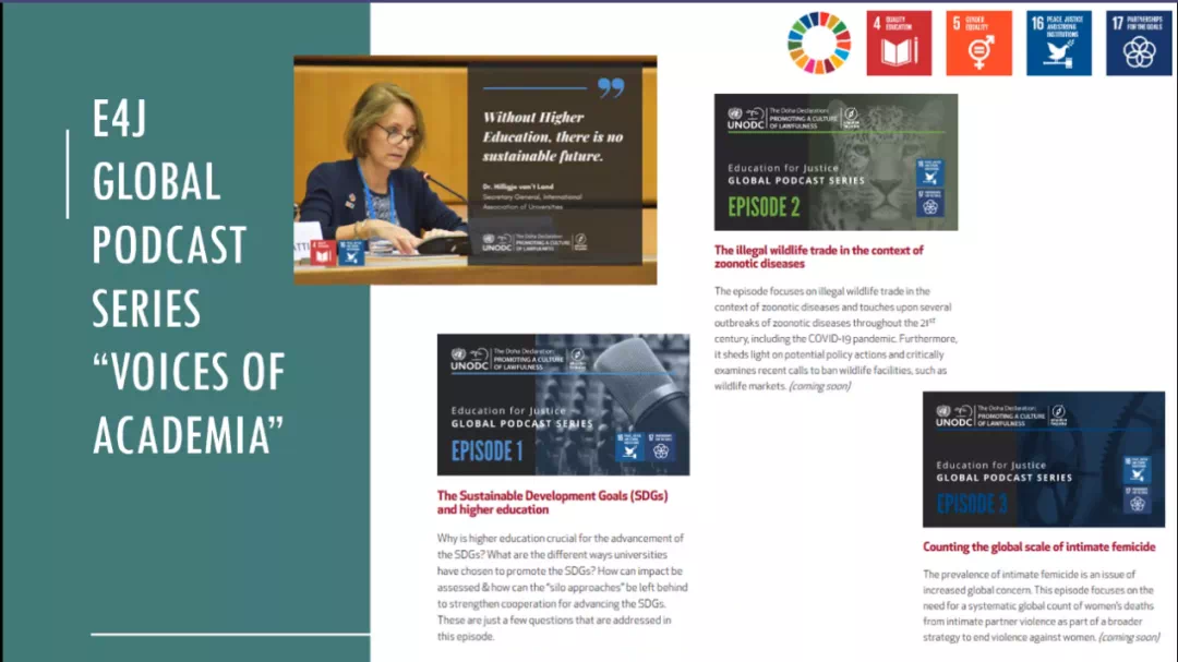 疫情期间,E4J应学者要求开发了一个全新的内容系列,即E4J全球播客系列:“学者之声”,每两周上线一次,主要包括与法治等领域学者的访谈内容,以供世界各国学生和其他学者学习使用。目前UNODC已和世界范围内数千名学者建立了联系网络。