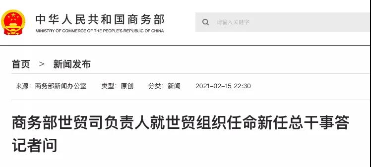 当前,新冠肺炎疫情蔓延态势尚未缓解,多边贸易体制面临重大挑战。中方对她担任世贸组织总干事充满信心。中方期待她履新之后,促进世贸组织尽快恢复正常功能,推动世贸组织在抗疫合作、经济复苏方面发挥更大作用,推动世贸组织第12届部长级会议取得积极成果,推进世贸组织必要改革,维护和增强多边贸易体制的权威性和有效性。