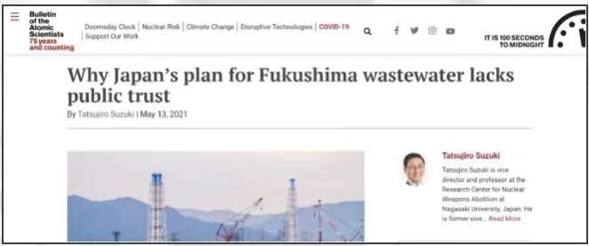 日本长崎大学废除核武器研究中心的副主任兼教授Tatsujiro Suzuki发表在《原子能科学家公报》(Bulletin of the Atomic Scientists)上的文章《为什么日本的福岛核污水计划缺乏公众信任》认为,即使是经过多核素去除设备(ALPS)处理过的核污水与其他常规排入大海的氚水也存在不同。核污水可能含有其他放射性物质,这些物质可能对人类健康和环境构成严重威胁。东京电力公司和经济产业部已经承认,福岛 70% 以上的核污水含有 62 种高于监管标准的其他核素。因此,核污水可能对环境和人类健康构成重大风险,损害福岛的渔业和农业。必须更仔细地评估将核污水排放到海中的环境、社会和经济影响。同时铃木达次郎教授认为,恢复公众对政府和东京电力公司信任至关重要。虽然他们承诺将对因核污水排放而受到负面影响的渔业企业进行补偿。但仅仅补偿是不够的,除非公众对整个核污水排海处理程序恢复信任,否则未来将会出现更多复杂的问题。最后,Tatsujiro Suzuki教授给日本政府提出三点核污水治理的建议,包括重新建立与主要利益相关者(包括渔业成员、当地公民、环保团体、科学家和有关国家的代表)沟通协商机制,在这样的机制建立之前,政府不应就核污水做出任何进一步的决定;其次,日本政府和电力公司应当继续探索向核污水排海的替代性方案;第三,日本政府应建立独立的监督机构,不仅要确保整个过程透明,而且要确保将未来风险控制在日本当地和国际社会可以接受的范围内。
