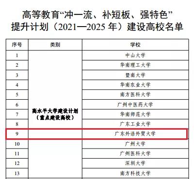 近日,广东省人民政府公布了新一轮高等教育“冲一流、补短板、强特色”提升计划建设实施方案(2021—2025 年)及建设高校名单,我校在上一轮“冲补强”提升计划建设期满考核中获评A级,由广东省高水平大学重点学科建设高校升格为整体建设高校。外国语言文学学科在期满考核中获评A+级,应用经济学、工商管理、法学学科获评A级,继续位居广东省高水平大学重点建设学科之列。此次升格是对学校整体办学水平和建设成效的充分肯定,是学校学科建设工作中取得的又一重大突破。