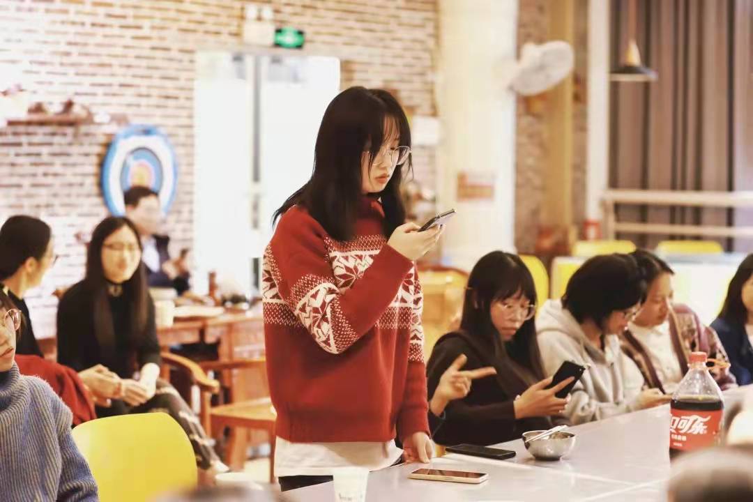 用餐完毕,大家围坐一桌玩游戏。先是紧张刺激的击鼓传花,再有报数游戏和“谁是卧底”。两位老师精心设计了问答环节,同学们敞开心扉,相互交流。19级徐红梅同学以“开心”、“勇敢”、“感恩”和“期待”四词概括她此刻的心情,她表示自己在研究院学会勇敢,并感恩相遇,期待明天;20级易晶明同学表示在研究院遇到良师益友,受益匪浅,走出迷茫;21级李豪同学表示,第一次参加工作时自己尚不熟悉,但有勤加思索,善于发问;21级许亚雄同学表达对前辈的感谢,表示以学长学姐为榜样,学习沟通。除此之外,还有许多同学以乐传情。20级刘小枭、谈小甜、李键敏和黄梦玲等几位同学献唱歌曲《成都》、《如果有来生》和《千千阙歌》。歌声悠扬悦耳,在场师生齐声合唱,场面感人。