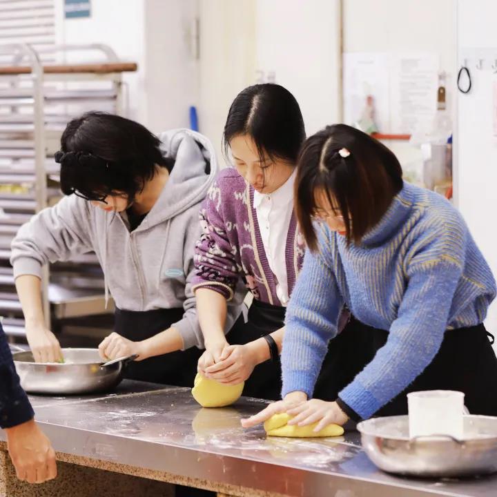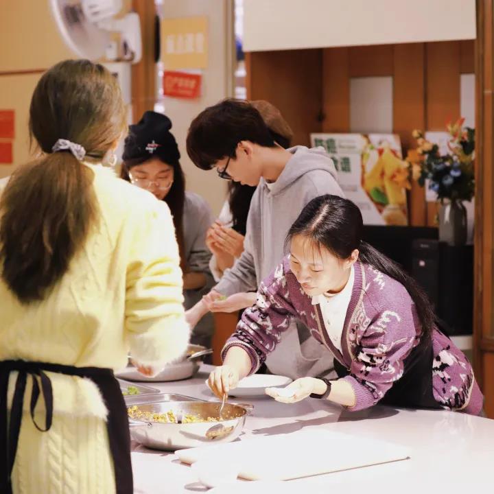 活动当天,食堂工作人员已预先准备馅料和工具。同学们在老师的带领下,同心协力制作饺子。素衣台案前,赵龙跃院长亲自教同学们擀面皮,他轻转擀面杖,细撒白面粉,耐心传授技巧;两位老师巧手赛天工,亲手示范包饺子。手中的饺子镶上了精致的花边,化身造型独特的元宝、鲜花和麦穗。同学们认真观察,动手尝试,发挥创意,制作出五颜六色的面皮和造型各异的饺子。饺子下锅,宛若清水飘芙蓉;饺子出炉,如同元宝落玉盘。之后,师生品尝饺子及各式配菜。