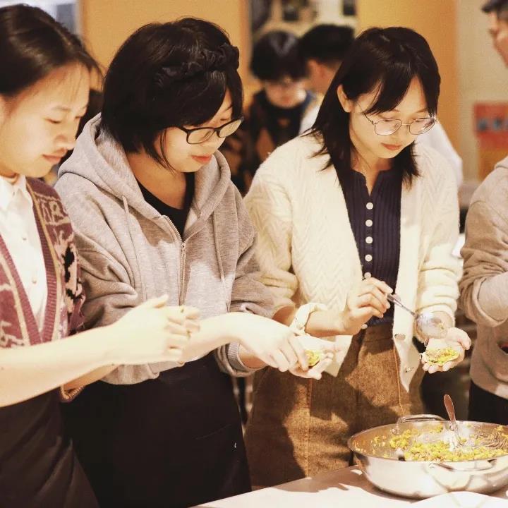看见一盘盘盈盈可爱的饺子,配上金黄香甜的拔丝地瓜、温润甜美的冰糖雪耳和香气袭人的锅包肉,大家食指大动,大饱口福。在场师生有说有笑,共叙情谊,场面欢乐和美。