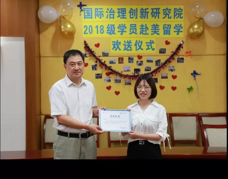 5月,国际治理创新研究院2018级学子赴美留学欢送会隆重举行。校党委书记隋广军教授出席欢送会时表示,研究院成立以来,不断发展壮大,开拓创新,精益求精,培养了一批又一批兼具家国情怀和国际视野的综合型复合型国际治理高端人才,嘱托同学们牢记责任和使命,在国际舞台上讲好中国故事,传播好中国声音。