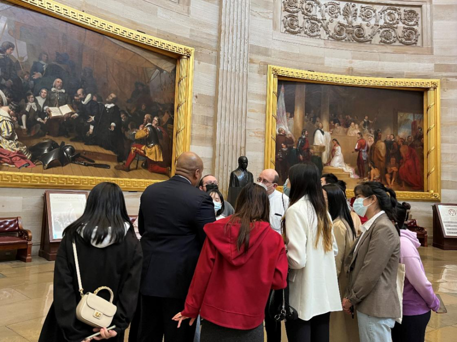 最后,同学们来到国会大厦游客中心下层的展览大厅。该大厅是美国唯一专门介绍国会和国会大厦建造过程的场所。重点展品包括国家档案馆和国会图书馆中罕见的历史性文件、全国各地的工艺品,以及一座高11英尺、可以触摸的国会大厦圆顶雕塑模型。