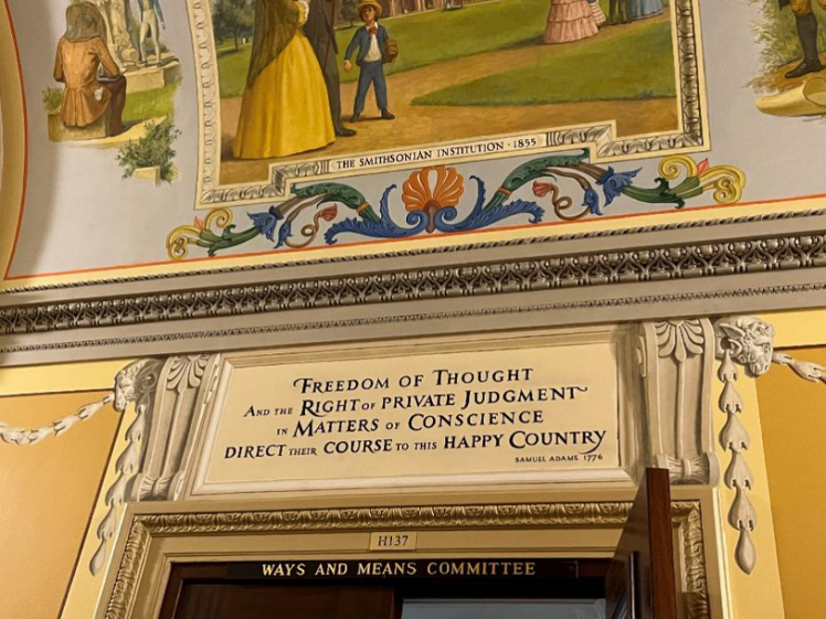皮特曼局长带领同学们从国会大厦南侧众议院进入,映入眼帘的是长廊两侧各州杰出名人的雕像以及众议院各委员会办公室,门楣与墙壁上装饰着历史壁画及标语,时刻提醒着后人勿忘自由与民主的力量。