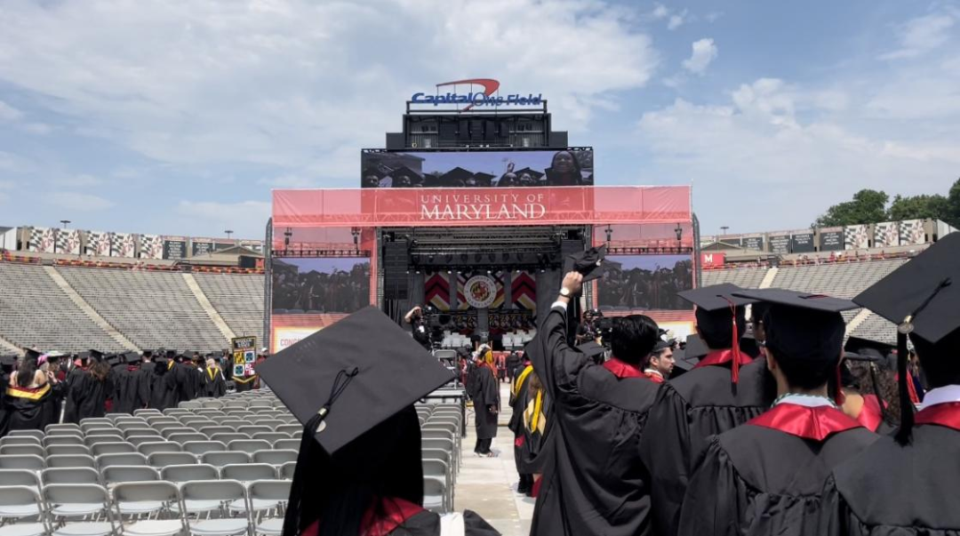 正午12点,学校领导、教授、校友及毕业生亲友们齐聚马里兰大学体育场,为毕业生们送上最真诚的祝福。这是一场特别的毕业典礼,是马大自疫情爆发以来第一次举行的线下毕业典礼。伴着亲友们的祝福与欢呼,2022届毕业生在荣誉校友们(Golden Terps)的注视下陆续入场。大屏幕上投印出了毕业生们一张张自信且坚定的笑脸,他们在这艳阳高照的五月奔向美好人生新征程。
