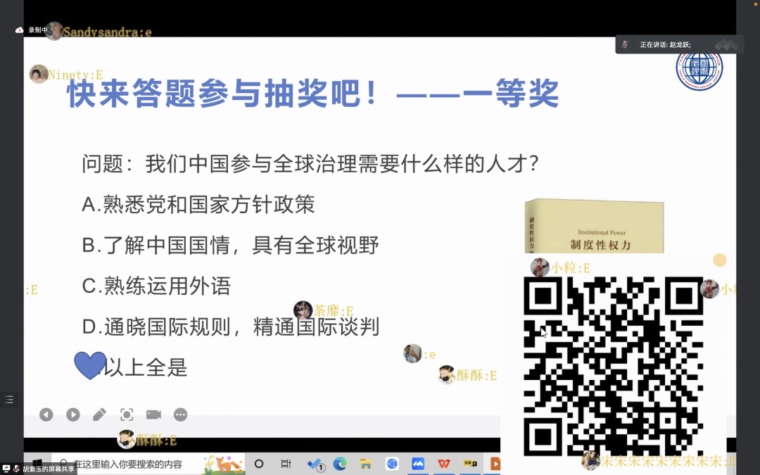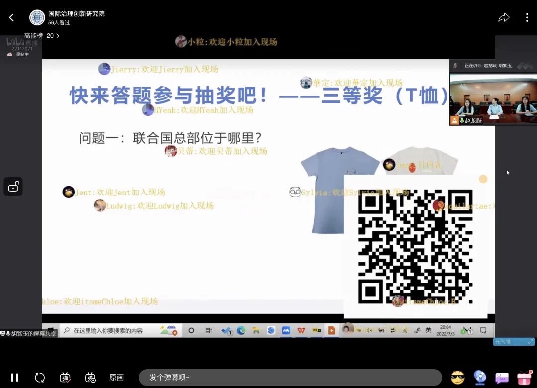 师兄师姐们依次与大家分享了自己在研究院学习和工作的感受与收获,并介绍了各自在国际组织实习工作的亲身经历,给同学们带来了极大的鼓舞。与此同时,同学们也通过弹幕纷纷提出自己的问题并对师兄师姐们的精彩答疑表示了衷心的感谢,互动热烈。