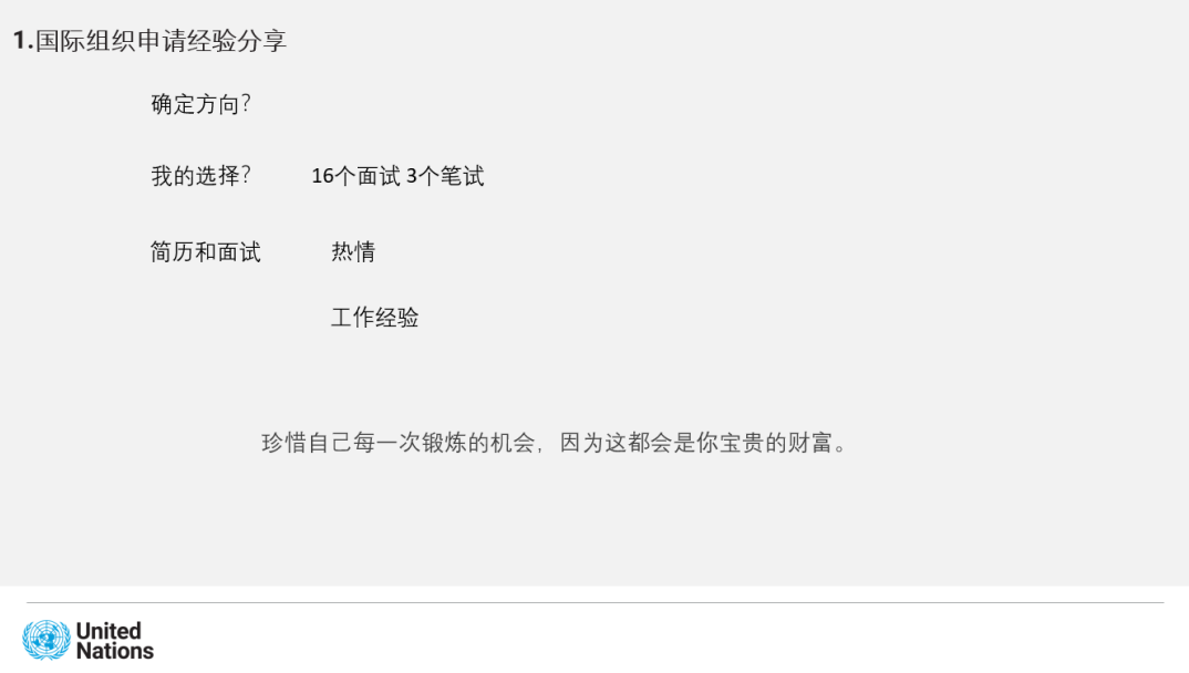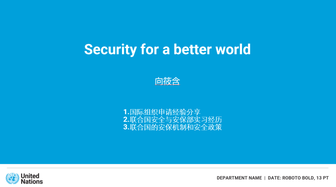 会议伊始,向筱含向大家介绍了选择加入联合国秘书处安全与安保部的初心。向筱含的父亲是一名刑侦警察,经常面对充满危险和挑战的案件,总是奔赴在案发现场。在申请国际组织实习期间,向筱含不断浏览联合国安全领域相关部门的信息,她为那些因公殉职的警察和维和人员所深深触动,并下定决心要用自己的力量保护那些正在保护这个世界的人。当看到各国派出的维和部队出现在索马里、阿富汗、巴勒斯坦等危险地带执行任务时,向筱含心中肃然起敬,她怀着热情申请加入了UNDSS,渴望为维护世界和平与保护各国人民的生命安全贡献自己的力量。