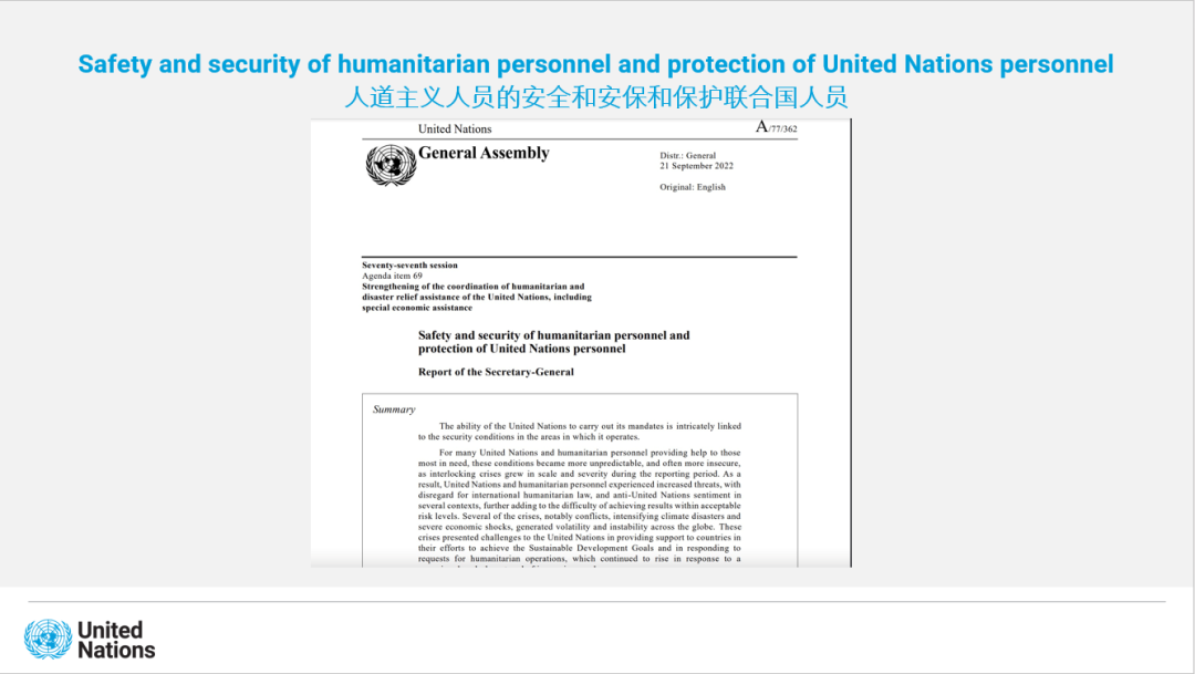向筱含通过联合国秘书处安全与安保部宣传片向大家介绍了该部门的主要工作内容,让同学们直观地感受到,无论在多么危险的地区,都能看到UNDSS工作人员正在为实现和平而奉献。随后,向筱含分享了一项令她印象深刻的工作,即撰写《人道主义人员的安全和安保和保护联合国人员》报告(Safety and security of humanitarian personnel and protection of United Nations personnel)。这份报告全面总结了联合国工作人员一年内为维护和平和提供人道主义救援所面临的工作情况,以及为解决问题所付出的努力。在工作过程中向筱含遇到了一些挑战,但这项工作最终在大家的不懈努力下顺利完成,那时她心中的充盈和自豪是难以言喻的。