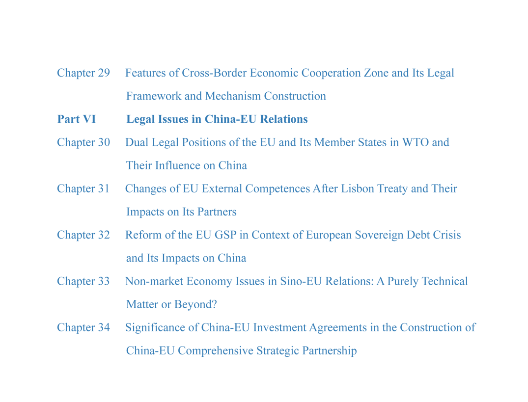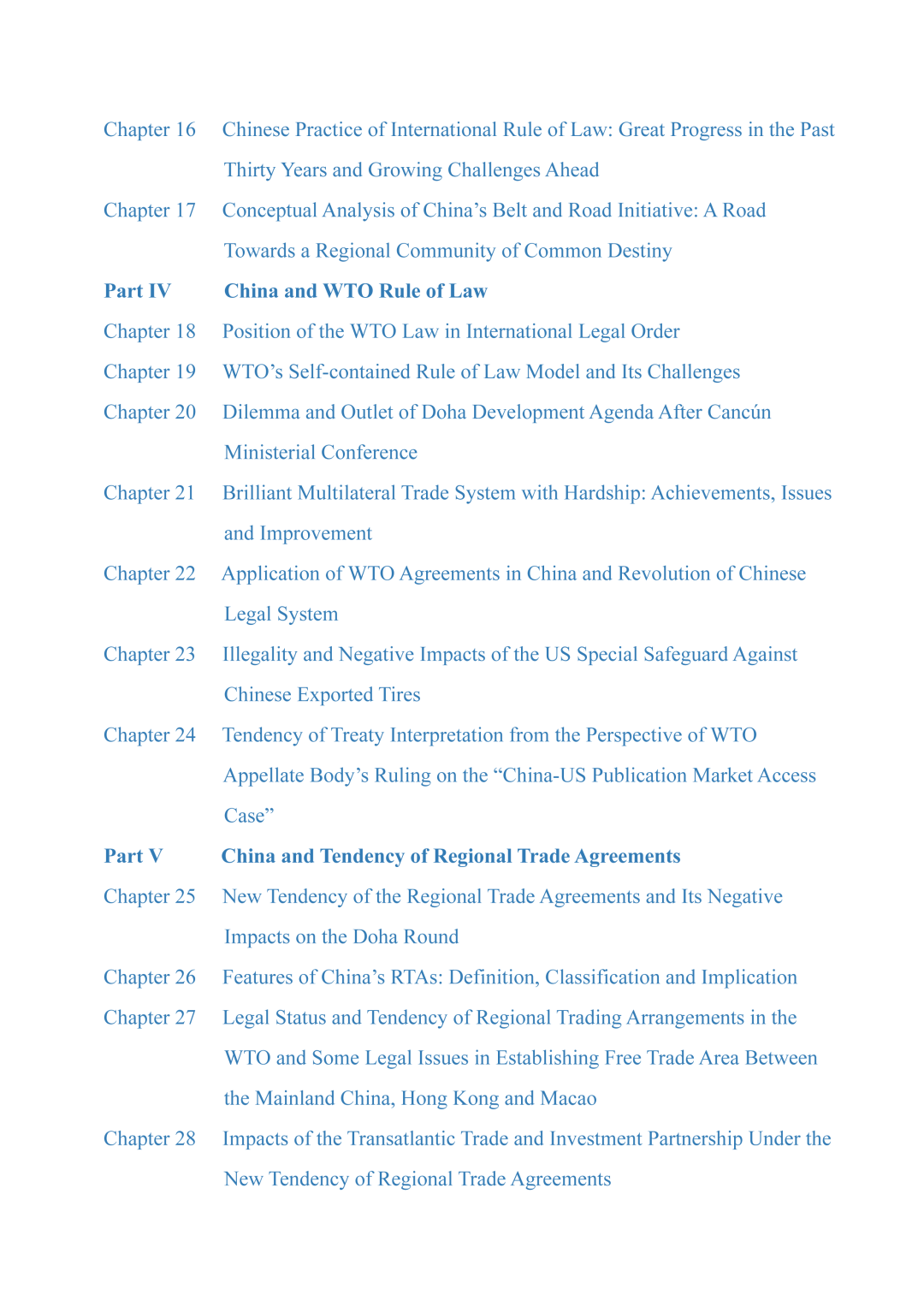 《当代国际法和中国的和平发展》(Contemporary International Law and China’s Peaceful Development)为本专著系列第一部力作,是武汉大学“人文社科资深教授”曾令良先生,应陈安教授之邀,为《当代中国与国际经济法学》专著系列所撰写。全书汇集了曾令良教授三十四篇经典著作,共分为六个部分:和谐世界、国际法与中国的和平发展;当代国际法的前沿问题;国际法与中国的和平发展;中国与WTO法治;中国与区域贸易协定的趋势;中国与欧盟关系中的法律问题。