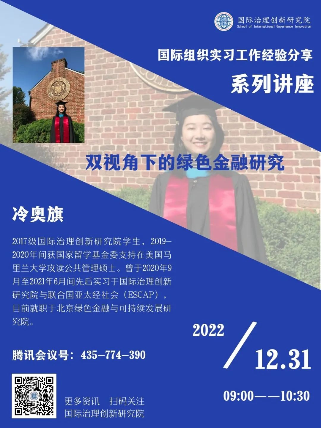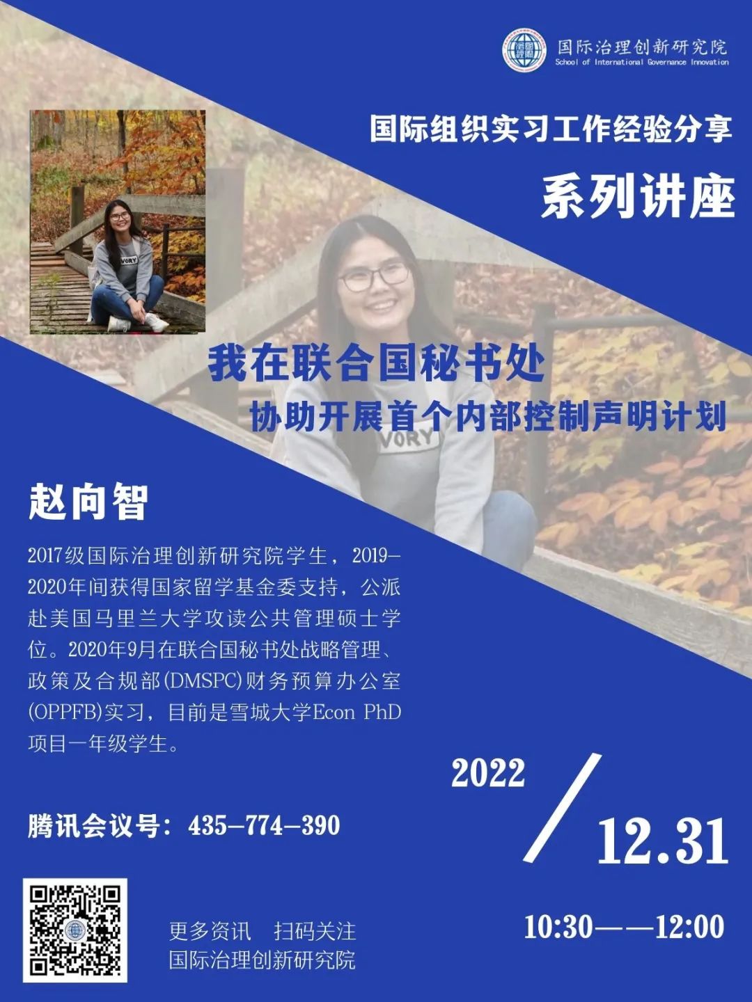 2022年12月31日,国际治理创新研究院将邀请2017级学子冷奥旗、2017级学子赵向智出席“国际组织实习工作经验分享系列讲座”。冷奥旗同学将介绍她在联合国亚洲及太平洋经济社会委员会(ESCAP)的实习经历及在北京绿色金融与可持续发展研究院的工作情况,她分享的题目是“双视角下的绿色金融研究”;赵向智同学将介绍她在联合国秘书处战略管理、政策及合规部(DMSPC)财务预算办公室(OPPFB)的实习工作情况,她分享的题目是“我在联合国秘书处协助开展首个内部控制声明计划”,欢迎老师同学们参加。