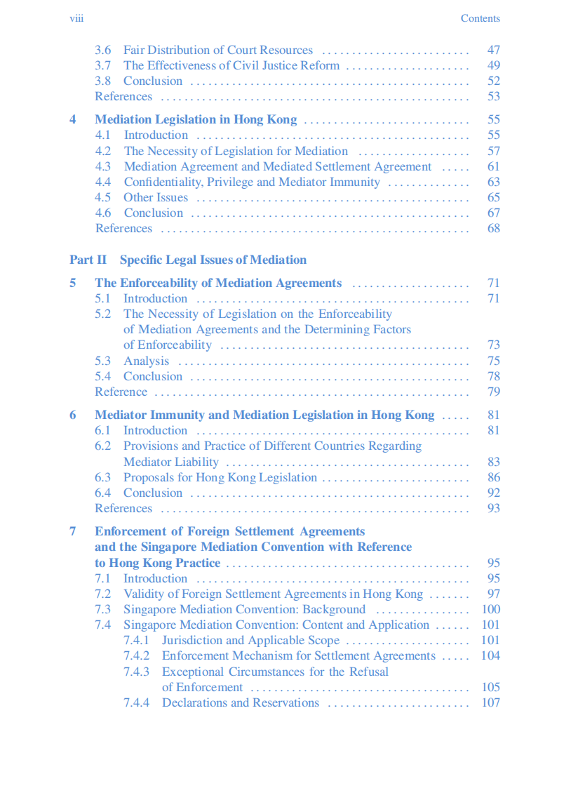 在此基础上,第二部分进一步分析了调解实践中具体的法律问题。在调解协议效力方面,第五章主要研究调解协议效力的立法必要性、判断调解协议有效的决定性因素、调解协议在合同法项下的效力、调解协议的确定性、仲裁与调解相结合时调解协议效力的判断等;在调解员责任豁免方面,第六章分析并总结了不同国家对调解员责任的确定方法和范围,结合之前香港有关调解立法的讨论,分析调解员责任的合理立法模式,并主张香港立法应采用限定豁免模式,即调解员是否应免责不能一概而论,而应因人因案而异;在和解协议的执行方面,第七章进一步研究了新加坡调解公约的诞生背景及其在实践中的运用,重点探究了涉外和解协议在香港的效力,并总结了新加坡调解公约对国际商事调解实践未来发展带来的启示。