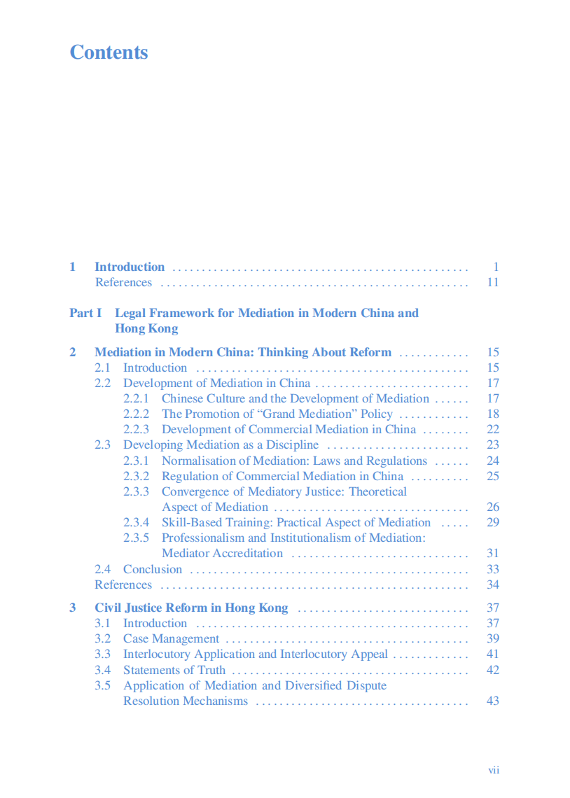《当代中国的调解和多元化争议解决》(Mediation and Alternative Dispute Resolution in Modern China)以当代中国的调解制度为主要研究范围,以推广调解专业化、学科化以及进一步完善我国调解制度为研究目标,着重对比并回顾了内地与香港的调解法律制度与立法改革历程,结合重点关注的调解法律问题,分别从理论和实践角度进行剖析,并将得出的理论框架用于解决具体行业的争议。