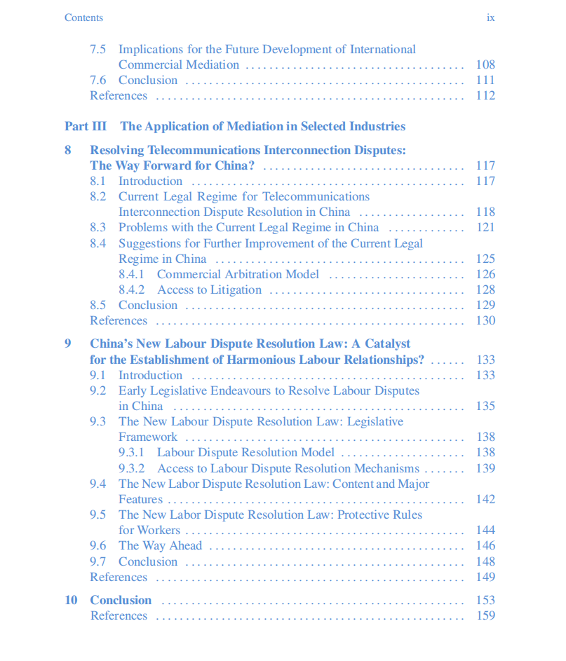 关于调解在具体行业中的运用,第八章总结了电信网间互联争议领域的法律制度以及所有可用的争议解决方案,分别探讨了每一种争议解决方法的有效性和不足之处,并给出完善电信网间互联争议解决法律制度的具体建议;第九章则关注中国解决劳动争议的法律制度与方法,总结并回顾了中国劳动争议解决的早期立法努力、政策考量、新环境下的挑战与法律应对措施等,同时勾勒出良好法治氛围下我国劳动争议解决制度的完善之路。