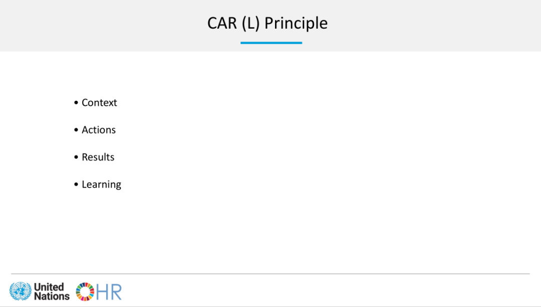 为了让大家更进一步了解面试注意事项,谢文龙以秘书处面试为例做了详细的说明。秘书处的面试指导手册要求任职者具备核心竞争力和管理竞争力。管理竞争力更多是对管理岗位人员的要求,而在核心竞争力方面,面试官比较注重的是沟通能力、团队协作能力及技术的应用与学习能力等。除此之外,面试官还会通过一系列问题来检验求职者的价值观是否与联合国的核心价值观(正直、专业、尊重多样性)相一致。在谈到如何更好地应对面试时,谢文龙向大家介绍了CAR(L)原则,该原则分为情境、行动、结果和学习反馈四步,同学们可以结合该原则认真准备,多加练习。谢文龙还特别提醒同学们,在陈述个人案例的时候,切忌假设而应当用实在的具体经历来回答。