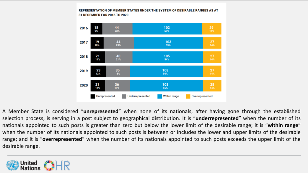 接下来,谢文龙重点分享了各个成员国在联合国中的人员任职情况。各国在联合国秘书处的人员配额采取适当幅度制度,以期实现人员配置的公平。秘书处根据会籍、会费和人口因数进行精密复杂的加权计算,将国家划分为无人任职(unrepresented)国家、任职不足(under represented)国家、合理任职(within range)国家和过度任职(over represented)国家四种类别。截至2022年9月31日,联合国网站数据显示,联合国拥有193个成员国,其中,无人任职国家有20个,任职不足国家有40个,合理任职国家有106个,过度任职国家有27个,中国正处于“任职不足”的类别当中。