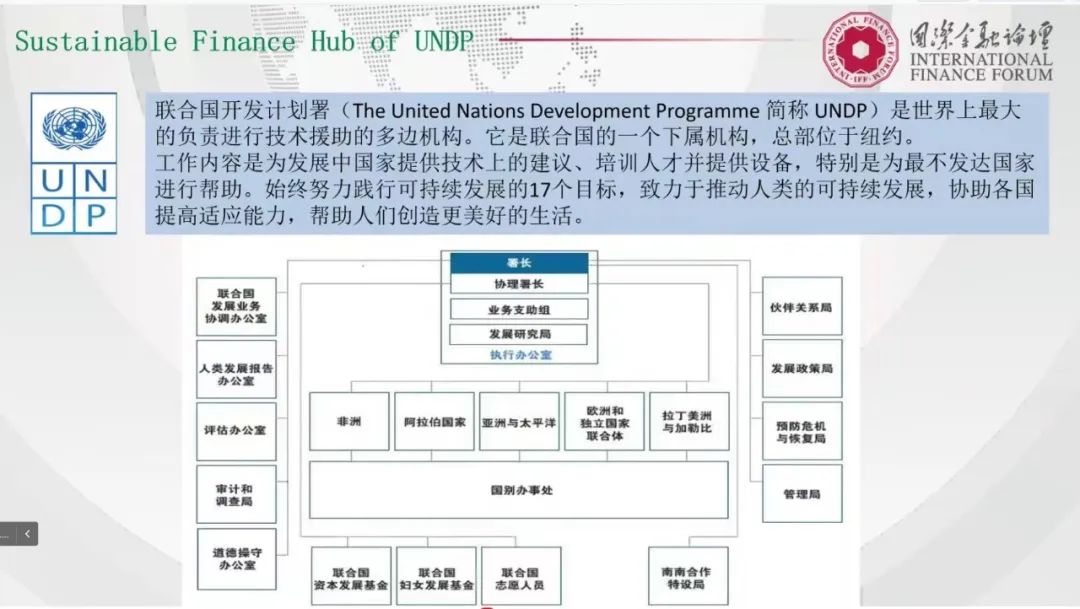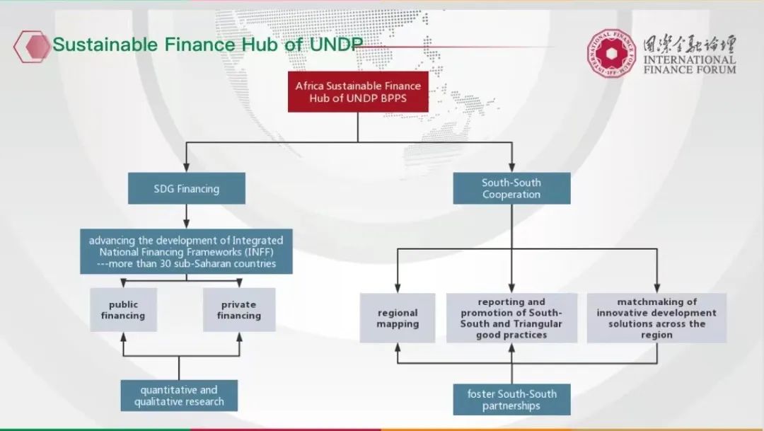 会议伊始,李阳阳向大家介绍了联合国开发计划署的概况及非洲可持续融资中心的组织架构。作为负责技术援助的多边机构,联合国开发计划署主要为发展中国家提供技术建议、人才培养、设备支持等帮助,并致力于推动人类可持续发展。李阳阳在非洲可持续融资中心的工作主要分为两个板块:一是SDG融资分析,主要负责在撒哈拉以南非洲推广UNDP的综合性国家融资框架——INFF(Integrated National Financing Frameworks)框架,进行撒哈拉以南非洲30多个国家的公共融资和私营融资分析,以满足不同国家的可持续融资需求;二是南南合作,通过区域融资画像、报告和推广南南合作及三角合作的成功实践为融资者匹配跨区域创新性的融资发展方案等方式,促进南方国家间的交流与合作。