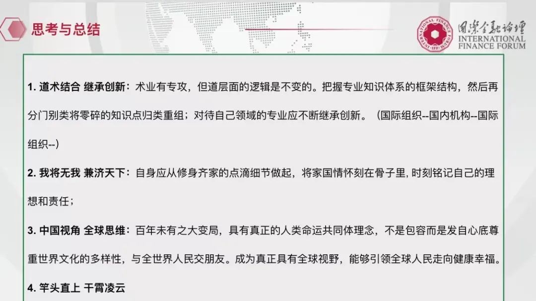 最后,李阳阳分享了他对国际治理与自身职业发展规划的四点思考与总结。一是针对专业领域,要做到“道术结合,继承创新”;二是针对理想责任,要做到“我将无我,兼济天下”;三是针对世界变局,要做到“中国视角,全球思维”;四是针对个人奋斗,要做到“竿头直上,干霄凌云”。