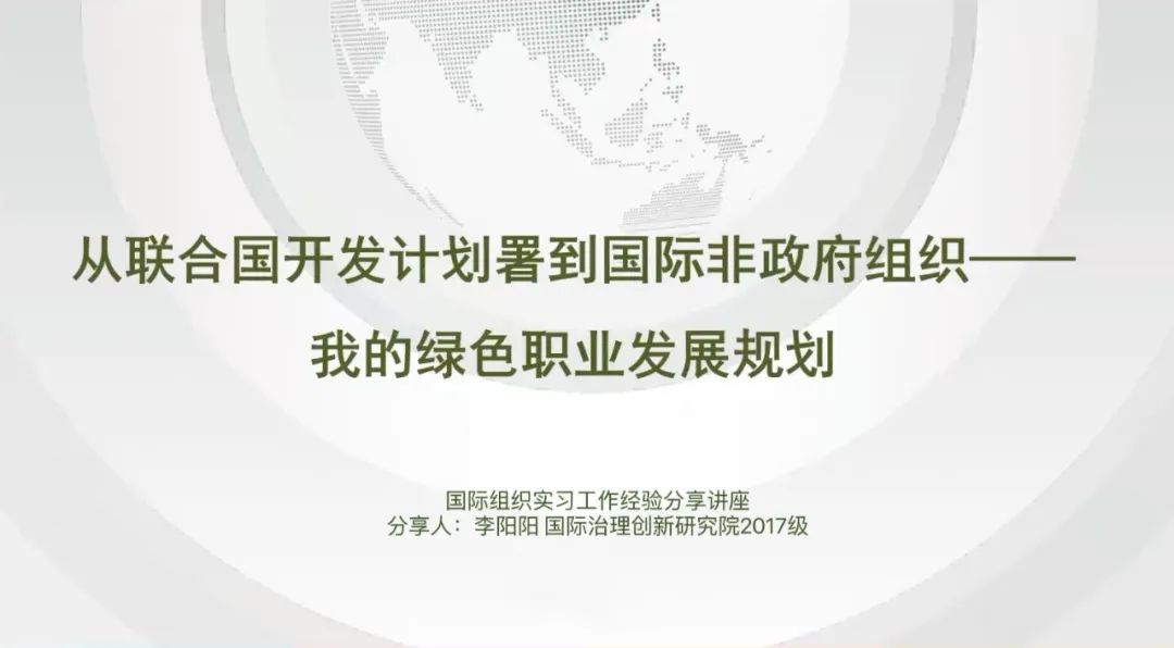 2022年12月24日上午,国际治理创新研究院于线上组织进行“国际组织实习工作经验分享系列讲座”第十讲。本次讲座由国际治理创新研究院院长赵龙跃教授主持,由研究院2017级学生李阳阳主讲。李阳阳曾在联合国开发计划署 (UNDP)非洲可持续融资中心实习,现就职于国际金融论坛(IFF)全球绿色增长中心(GGGC),从事国际碳定价机制和绿色金融研究。他以“从联合国开发计划署到国际非政府组织——我的绿色职业发展规划”为题,从国际碳定价机制和绿色金融的专业角度出发,着重介绍了他在联合国开发计划署实习和国际金融论坛工作的经历,并分享了他对国际治理与自身职业发展规划的思考。