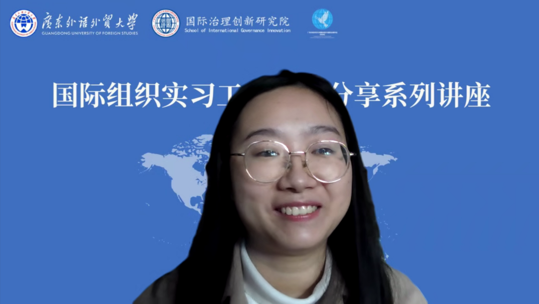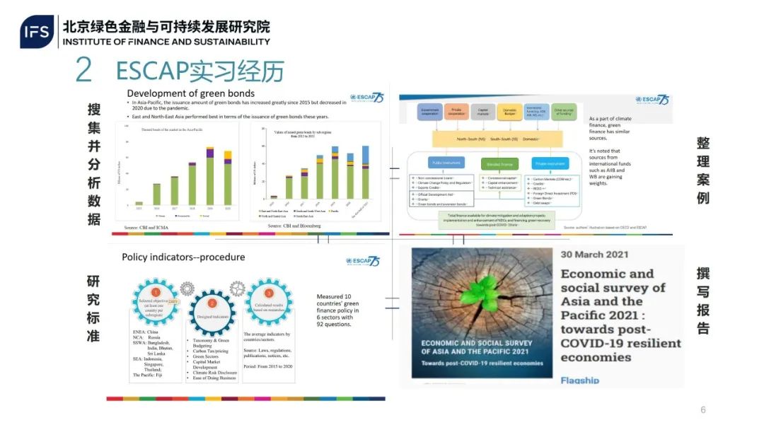 讲座伊始,冷奥旗简要回顾了自己的学习成长历程。研究生期间,她同时就读于广东外语外贸大学经济贸易学院和国际治理创新研究院,之后获国家留学基金管理委员会资助,赴马里兰大学攻读公共管理硕士学位,毕业后进入联合国亚太经社会实习。在实习期间,她主要从事绿色金融研究相关工作,工作内容包括搜集并分析绿色债券有关数据、整理案例信息、研究绿色金融标准以及撰写研究报告。此外,她还参与了中小企业可持续发展研究、能力建设培训等项目。