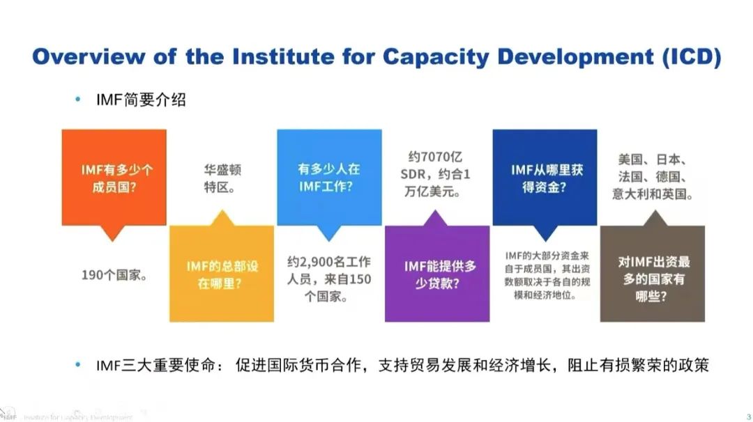 会议伊始,华定简要介绍了国际货币基金组织的背景、功能以及重要使命。国际货币基金组织具有三大核心功能:监督工作、资金援助和能力建设。华定所在的能力建设研究院(The Institute for Capacity Development)主要负责推动“能力建设”工作的开展,尝试通过提供技术援助、培训项目等方式帮助成员国建立有效的经济结构,提高经济稳定性,促进经济增长及实现可持续发展目标。具体的工作开展方式包括在华盛顿总部以及分设在不同国家的全球区域能力建设中心为各国政府提供技术援助和培训、开发在线课程(例如Digital Training Catalogue、edX)等。华定强烈建议有兴趣的同学们注册并学习面向公众开放的网络在线教学课程——edX,做到主动学习,不断实现自我更新。