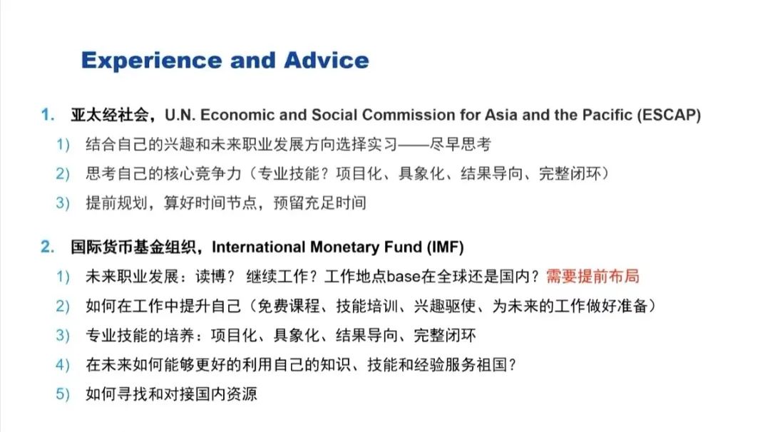 最后,华定围绕“尽早思考”与“持续学习”两个方面与同学们分享他在申请国际组织实习和工作中的经验。在“尽早思考”方面,华定建议同学们要尽早确认自己的兴趣和未来的职业发展方向,尽早申请实习岗位,尽早布局具体的职业发展规划,算好时间节点,预留充足的时间。在职业规划中,还要考虑未来如何寻找和对接国内的资源以及如何更好地利用自己的知识、技能和经验服务祖国,努力为自己的未来绘制一份清晰的蓝图。在“持续学习”方面,华定认为在申请实习以及工作岗位的过程中要不断加强自己的核心竞争力。国际治理创新研究院“五位一体”的培养模式毫无疑问为同学们增添了一大亮点。除此之外,专业技能的培养也十分重要,掌握基本的计量软件和编程软件并将其项目化、具象化地呈现出来,能够极大提高自己的职业竞争力。