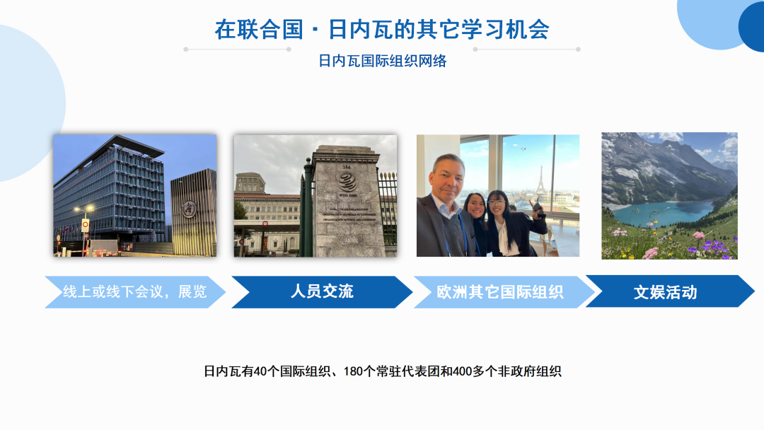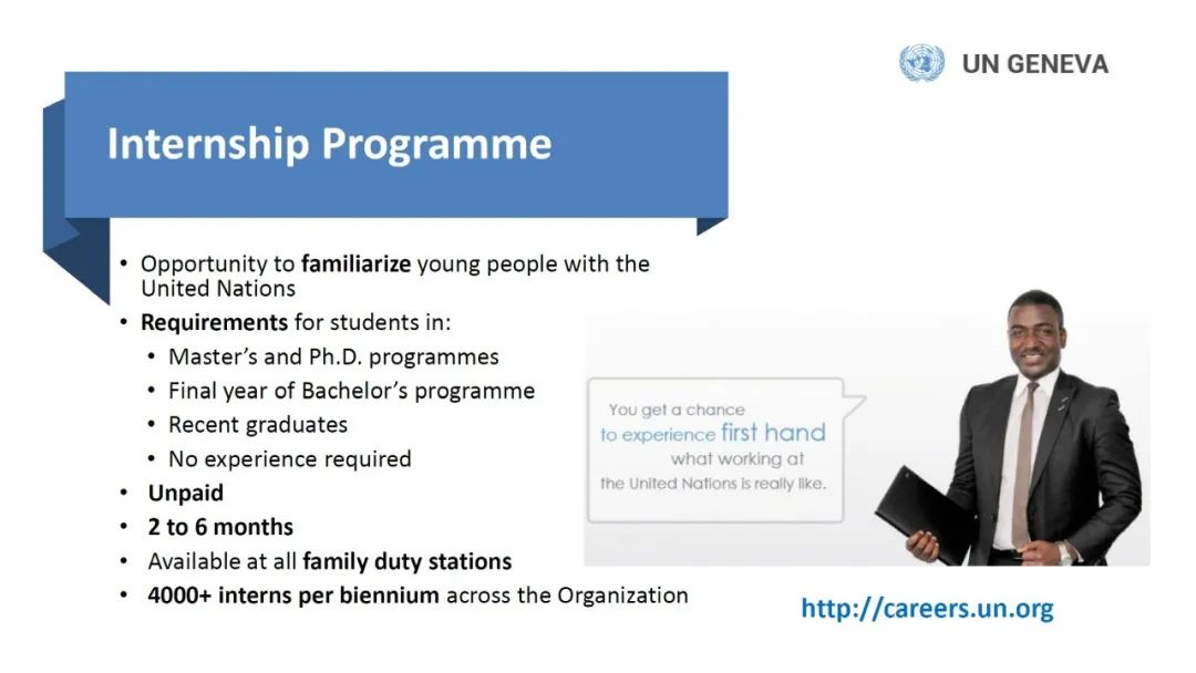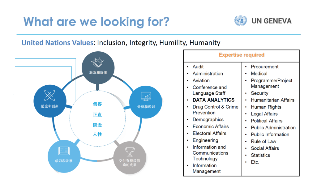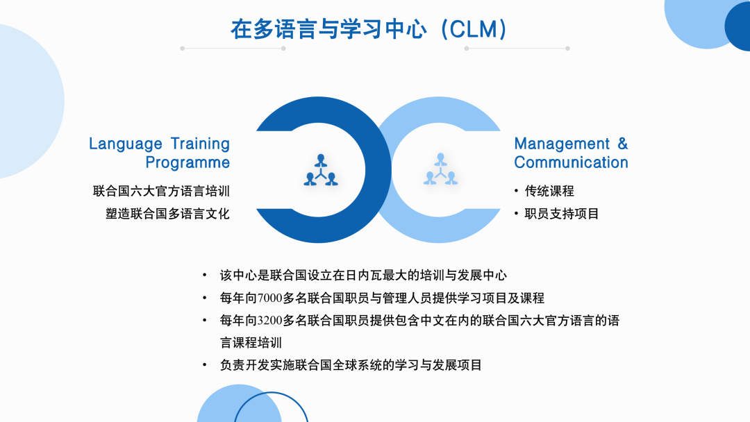 宋紫婷所在的联合国日内瓦办事处多语言与学习中心是联合国设在日内瓦最大的培训与发展中心,负责向联合国职员提供联合国六大官方语言的课程培训、开发并实施联合国全球系统的学习与发展项目,助力联合国职员实现终身学习的目标。根据宋紫婷介绍,她的工作职责包括协助部门开展有关联合国职员需求的评估调查、协助开发并组织面向国际组织全体职员及管理人员的培训项目、搭建联合国职业发展指导平台等。