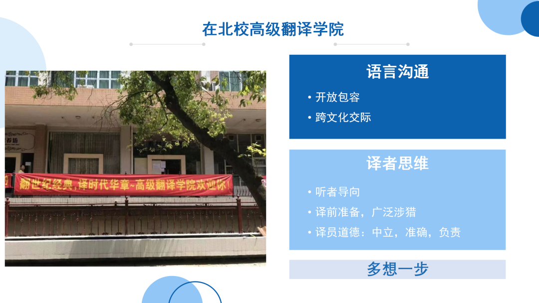 宋紫婷围绕她在高级翻译学院和国际治理创新研究院的学习生活展开分享。她认为在高级翻译学院的学习提高了自身的“语言沟通”和“跨文化交际”能力,培养了她的“译者思维”,与她在国际组织的实习工作高度契合。宋紫婷指出,语言是钥匙,开放包容的心态是前提。在高级翻译学院的学习不仅使自身听说读写能力得到提高,更是培养了自己面对多元文化的正确态度。在“译者思维”方面,宋紫婷指出口译员需要树立“听者导向”的意识,即口译输出应考虑输出内容能否为听者所理解,这一点与联合国等国际组织职员应当具备的“客户导向”意识具有异曲同工之处。同时,优秀的口译表现离不开扎实的译前准备,译员需要不断拓宽自身知识广度、提高自主学习能力,这些技能在国际组织实习工作过程中都发挥了重要作用。此外,中立、准确、负责的职业译员道德规范对她在联合国的实习工作起到了借鉴意义。最后,宋紫婷从“译者思维”提炼出“多想一步”的工作方法,强调凡事多想一步、多做一层是精进工作、脱颖而出的关键。