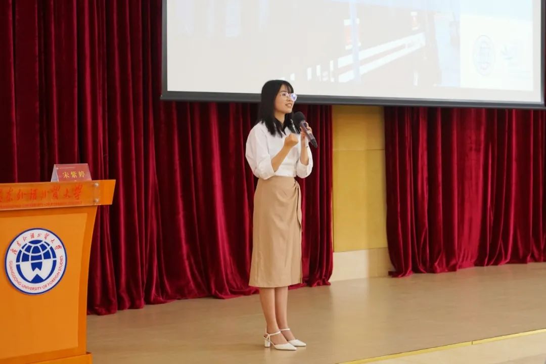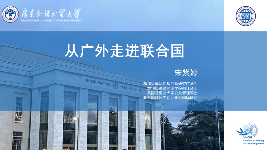 随后,宋紫婷以“从广外走进联合国”为题,分别从“学习篇”和“工作篇”两部分详细分享了她在广外学习以及国际组织实习过程中的经验感想。