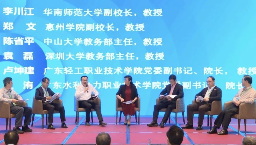 短暂的茶歇后,进入到论坛的第二环节——圆桌讨论。本次圆桌讨论由广东省高等教育学会副会长、暨南大学副校长饶敏教授主持,华南师范大学副校长李川江教授,广东省高等教育学会副会长、惠州学院副校长郑文教授,中山大学教务部主任陈省平教授,深圳大学教务部主任袁磊教授,广东轻工职业技术学院党委副书记兼院长卢坤建教授,广东水利电力职业技术学院党委副书记兼院长江洧教授参与。六位嘉宾简明扼要地表达了自己关于全面提高人才自主培养的实现策略并与听众们积极互动,耐心解答大家的问题,坚定了大家不断探索自主发展创新人才培养的决心。