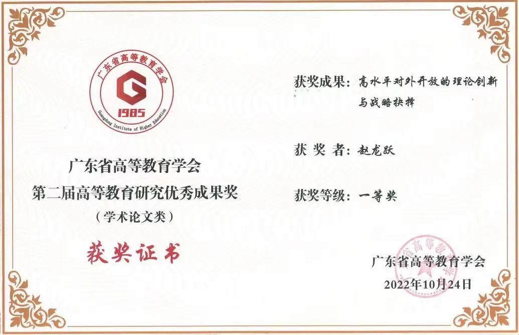 随后,在广东省高等教育学会副会长、岭南师范学院党委书记兰艳泽教授的主持下,学会副会长为优秀成果一等奖获得者颁奖,部分获奖代表发表了感言。国际治理创新研究院院长赵龙跃教授的论文《高水平对外开放的理论创新与战略抉择》获得广东省高等教育学会第二届高等教育研究优秀成果奖(学术论文类)优秀论文一等奖。最后,魏中林教授作会议总结性讲话,广东省高等教育学会第六届理事会第五次会议暨学术论坛落下帷幕。